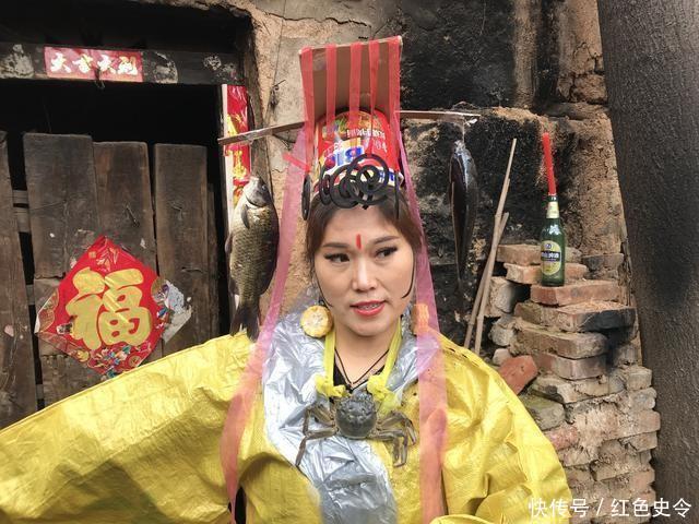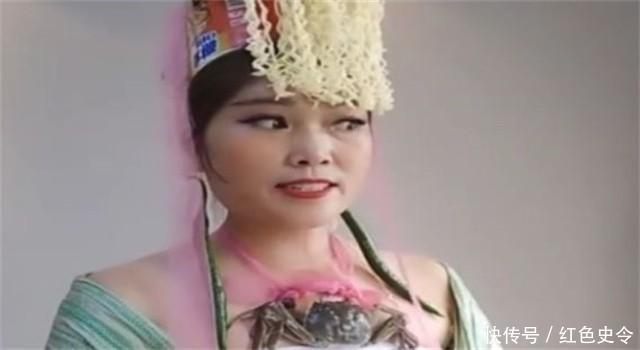 曹占茹制作说念具的器具时时是赶快取材,随机候胸前挂个螃蟹,头顶垂挂两条活鱼,随机候地里采摘的青菜稍作打理之后,就口舌常完好意思的“头饰”。